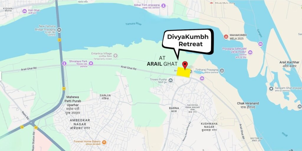 Our VIP Tents are situated at Arail Ghat, which is just 1 km from Triveni Sangam. The exclusive tent city at Arail Ghat, authorized by Prayagraj Mela Authority governed by Uttar Pradesh Government. We are 4 km from Prayagraj Railway Junction & 12 km from Prayagraj Airport.